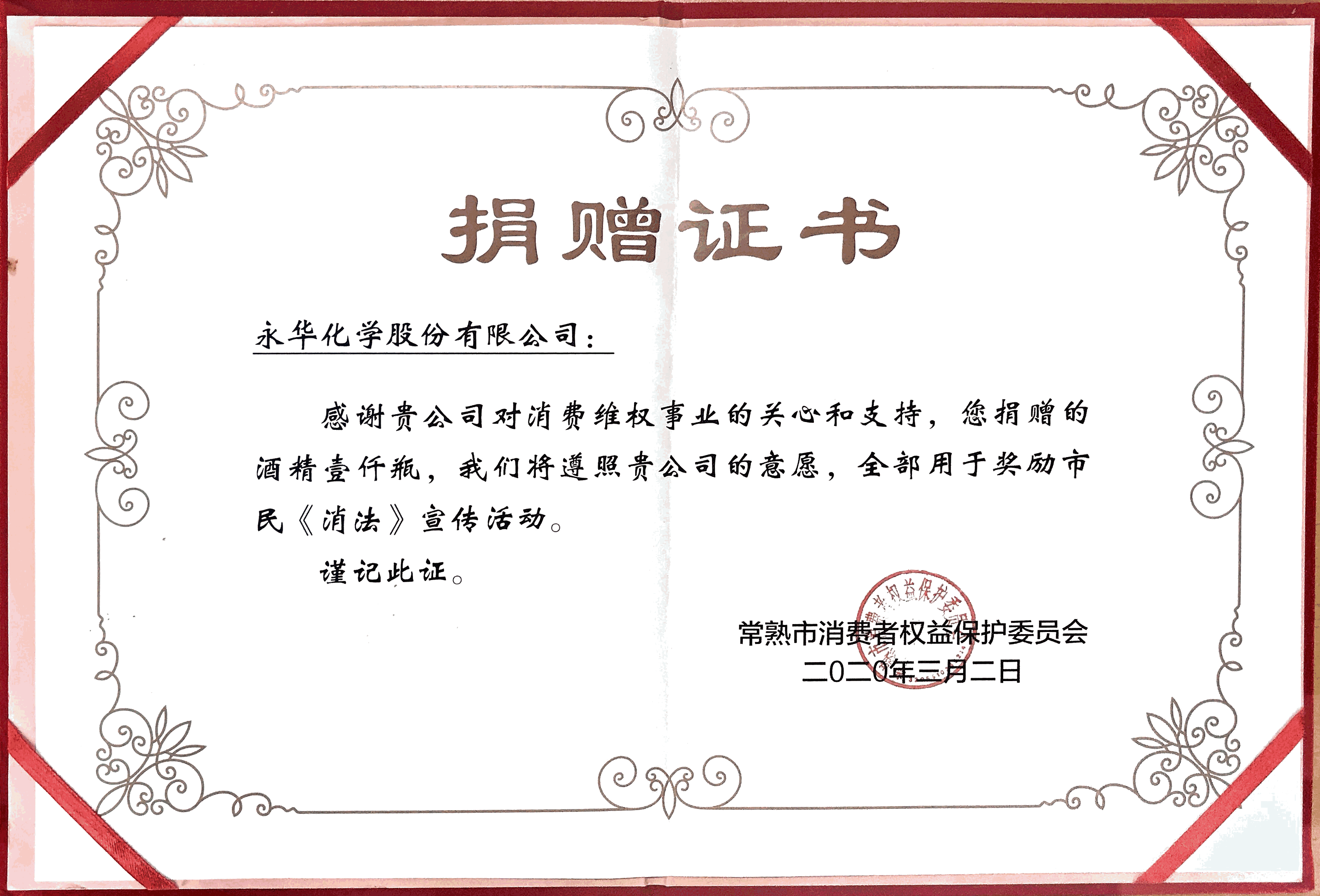 新冠肺炎疫情發(fā)生以來,疫情防控工作牽動(dòng)著每個(gè)人的心。永華一直高度關(guān)注疫情發(fā)展,在按照規(guī)定認(rèn)真做好公司疫情防控和生產(chǎn)經(jīng)營部署的同時(shí),積極踐行社會(huì)責(zé)任。我公司向消費(fèi)者權(quán)益保護(hù)委員會(huì)捐贈(zèng)了一千瓶酒精,用于獎(jiǎng)勵(lì)市民《消法》宣傳活動(dòng)。