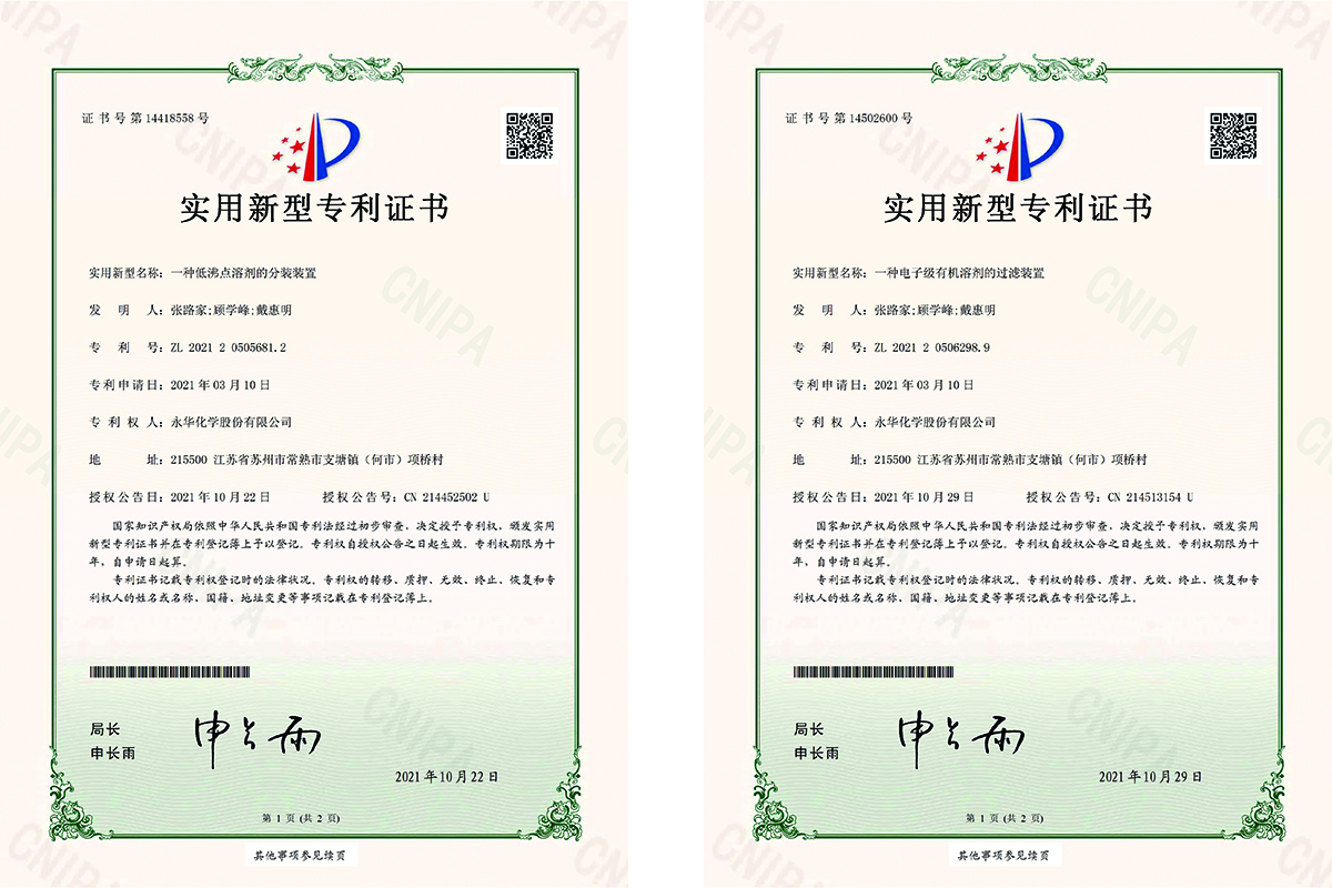 近年來(lái),永華化學(xué)股份一直重視科技創(chuàng)新,不斷引進(jìn)高素質(zhì)人才,加大科研經(jīng)費(fèi)投入,注重知識(shí)產(chǎn)權(quán)保護(hù)。目前我司已經(jīng)獲得4項(xiàng)實(shí)用新型專(zhuān)利,1項(xiàng)發(fā)明專(zhuān)利,這些專(zhuān)利的獲得為我司日后的發(fā)展奠定了基礎(chǔ),提升了我司產(chǎn)品的競(jìng)爭(zhēng)力,相信在未來(lái),永華會(huì)發(fā)展的越來(lái)越好!