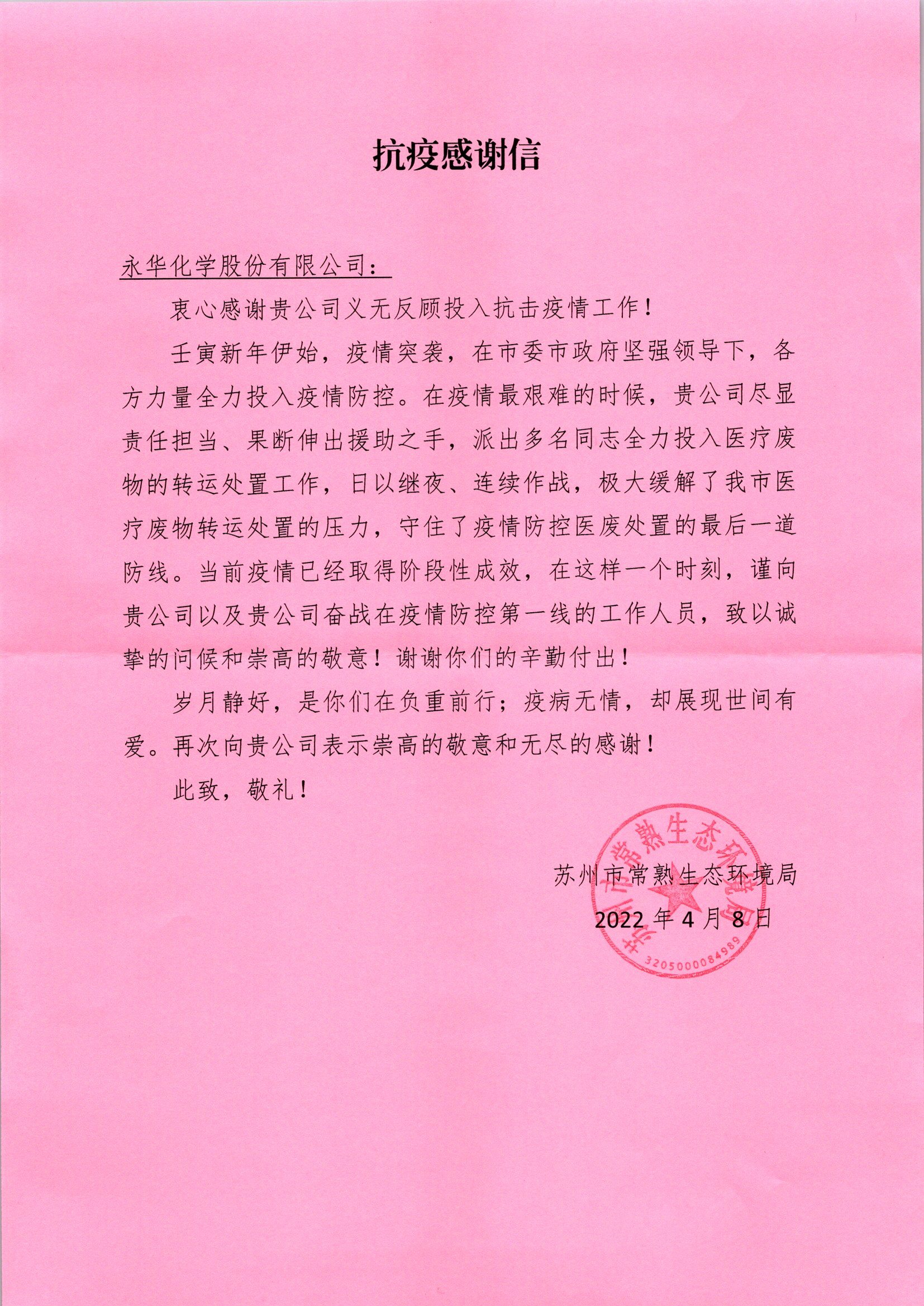 4月8日,我司收到了一封來(lái)自蘇州市常熟生態(tài)環(huán)境局的一封感謝信,感謝我司在疫情最艱難的時(shí)候,伸出援助之手,緩解了我市醫(yī)療廢物轉(zhuǎn)運(yùn)處置的壓力。