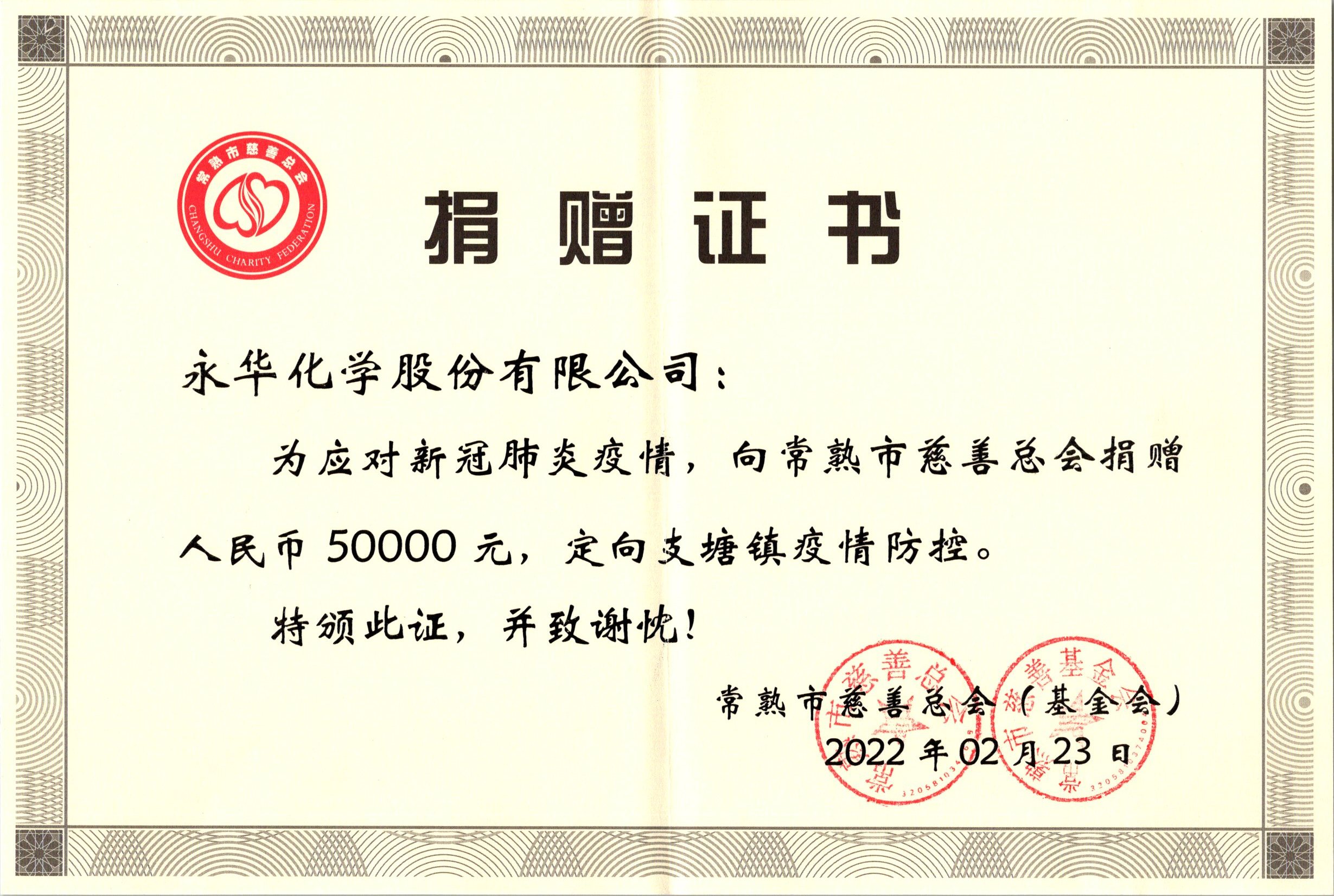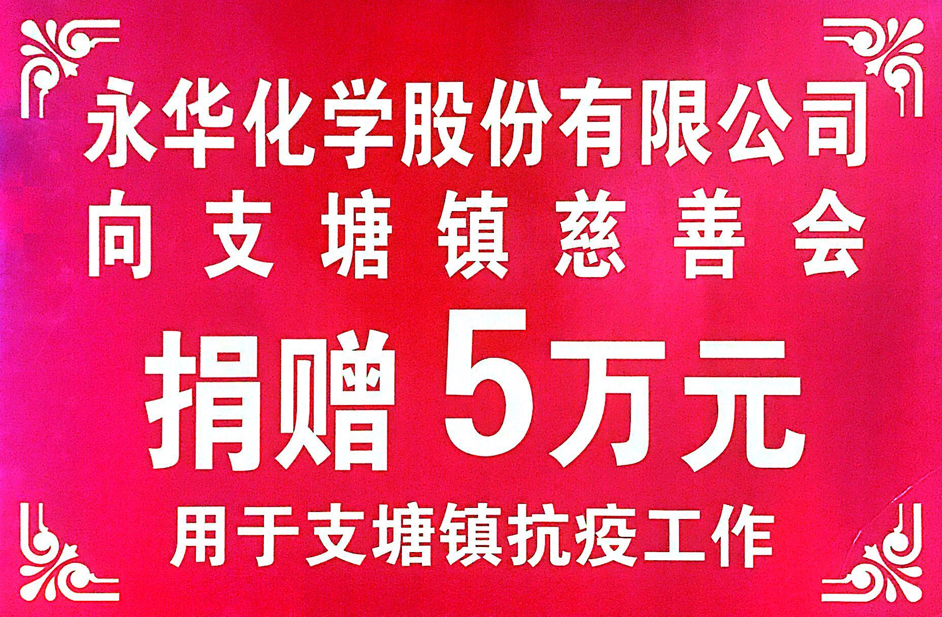 疫情無情,人間有情。針對突襲的新冠肺炎疫情,作為社會團(tuán)體的一員,今年2月永華化學(xué)主動(dòng)向常熟市慈善總會捐贈(zèng)5萬元,定向用于支塘疫情防控工作。