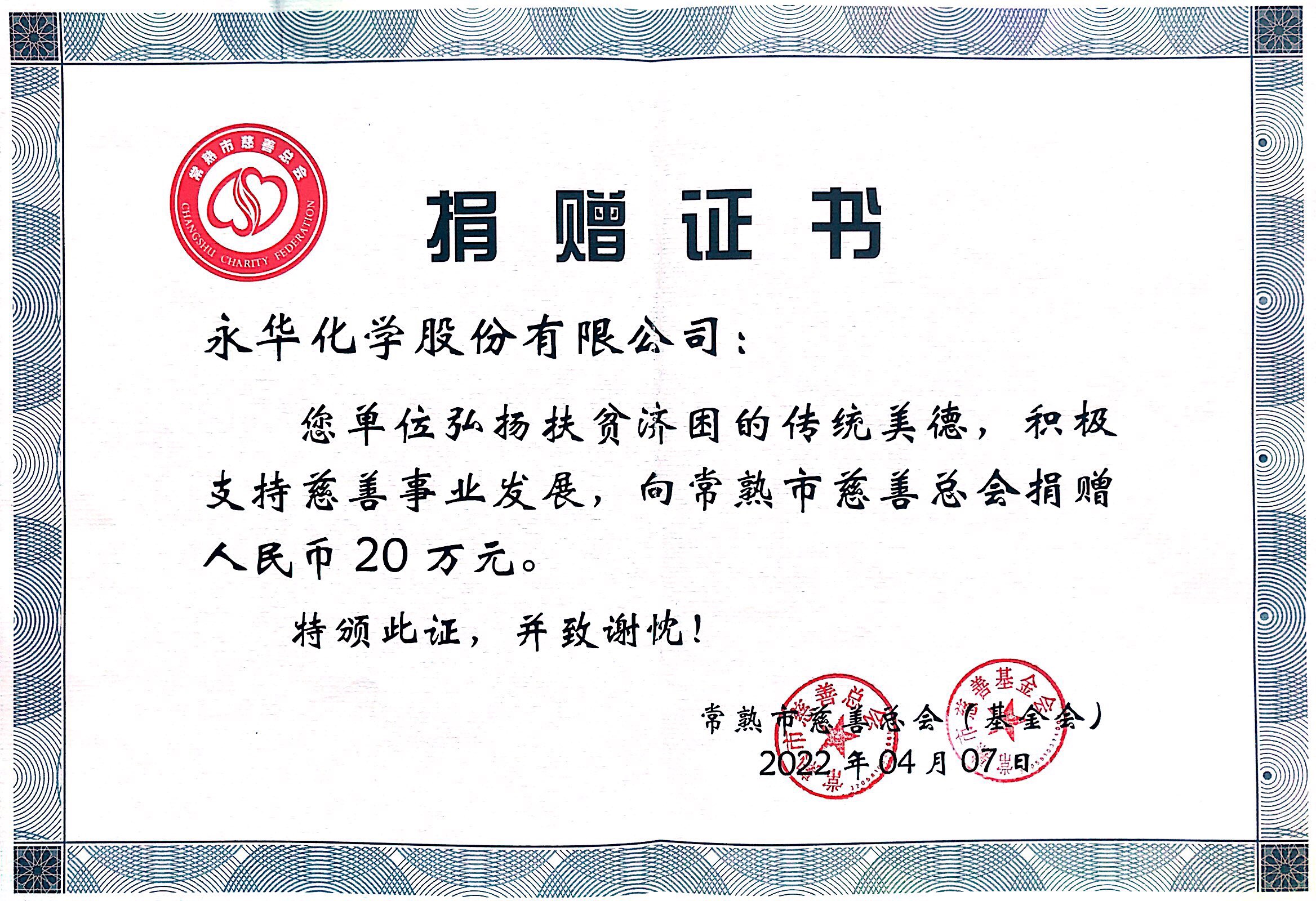4月,為響應(yīng)建設(shè)“善美常熟 小城大愛”,圍繞鄉(xiāng)村振興、共同富裕,進(jìn)一步在全社會弘揚(yáng)樂善好施、扶貧濟(jì)困的傳統(tǒng)美德,永華化學(xué)向常熟市慈善總會捐贈(zèng)人民幣20萬元。捐贈(zèng)是真誠的,關(guān)愛是無價(jià)的,授人玫瑰,手有余香,奉獻(xiàn)愛心,收獲希望。